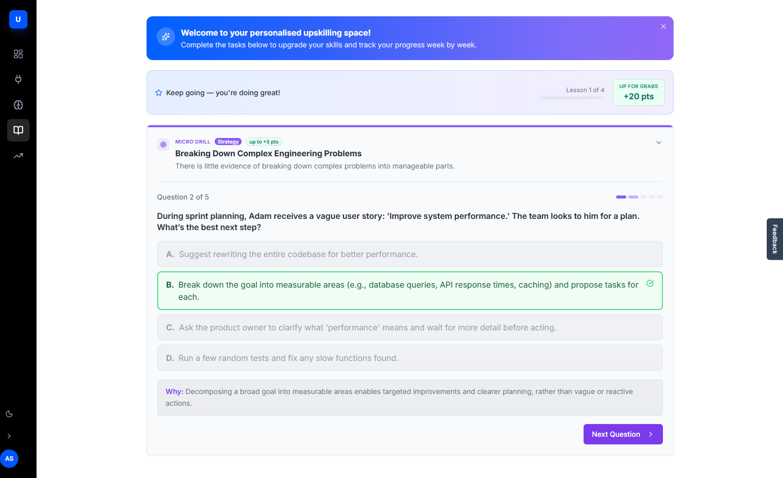 Upskill is an enterprise-grade SaaS platform designed to bridge the gap between daily work output and professional development. By integrating directly into a team's digital ecosystem via Slack and Google Workspace, the platform autonomously detects skill strengths and gaps — without any manual input.